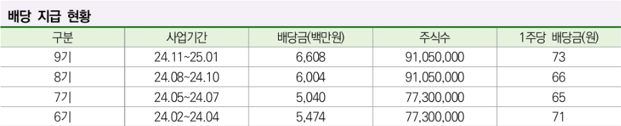 - 공모가 기준 배당률: 연 약 5.6% 예상(공모가 5,000원 기준) / 2025년 6월 17일 기준 주가 4,440원으로 배당률은 6.3%