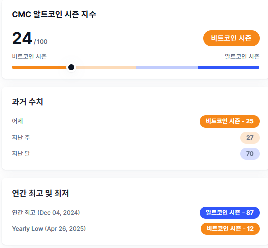 ※ 비트코인과 알트코인의 시즌 지수 비교입니다. 알트코인이 험난한 시기를 지나고 있음을 보여주고 있습니다.